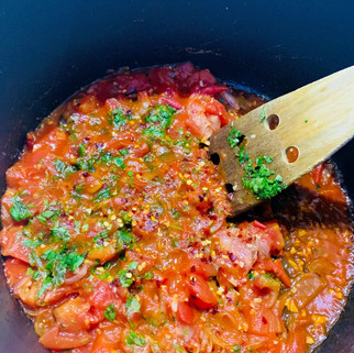Add the tomato puree, pepper, herbs and chopped tomatoes, and simmer for 2-3 minutes, then add the stock and combine. Allow to simmer for around 15 minutes and half of the liquid has cooked off.